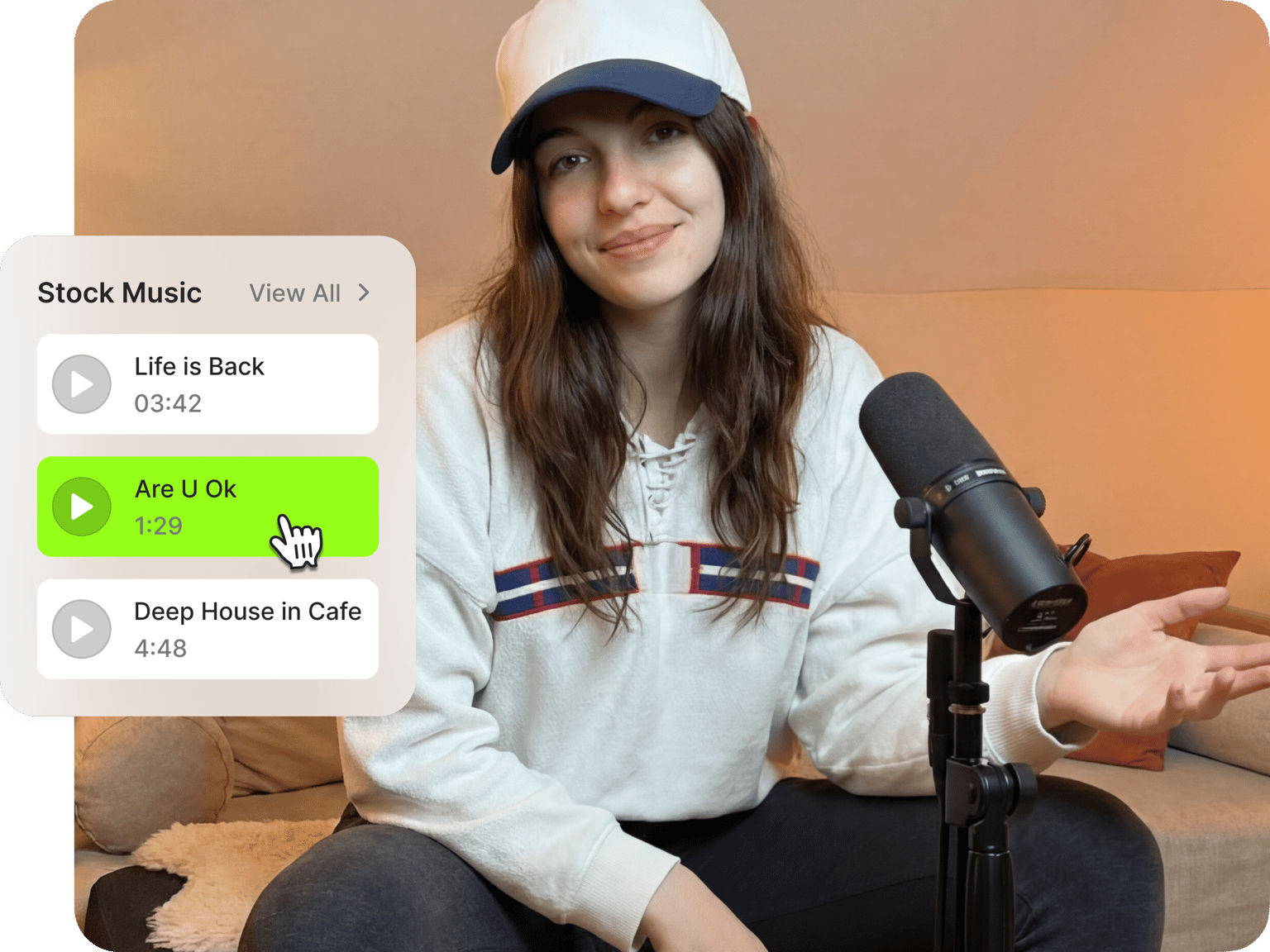 একটি ভিডিওতে আপনার নিজস্ব ভয়েস ওভার যুক্ত করুন। আপনার ভয়েস ওভার রেকর্ড করুন, আপলোড করুন এবং আপনার ভিডিওতে যুক্ত করুন। অথবা, অনলাইনে একটি ভিডিওতে আপনার নিজস্ব ব্যাকগ্রাউন্ড মিউজিক যুক্ত করুন - সেটি প্রফেশনাল ভিডিও, শিক্ষামূলক বা একটি ভিডিও অ্যাড যাই হোক না কেন। আপনার ভিডিওতে মিউজিক যুক্ত করলে এটি দর্শকদের জন্য আরও এংগেজিং হয়ে যায় - ভিন্ন ভিন্ন মুড তৈরি করুন, সাউন্ড ইফেক্ট ব্যবহার করুন এবং আরও অনেক কিছু! VEED এর অনলাইন ভিডিও এডিটিং সফটওয়্যার ব্যবহার করে আপনার ভিডিও ক্লিপে যে কোন ধরণের অডিও যুক্ত করা একেবারেই সহজ।