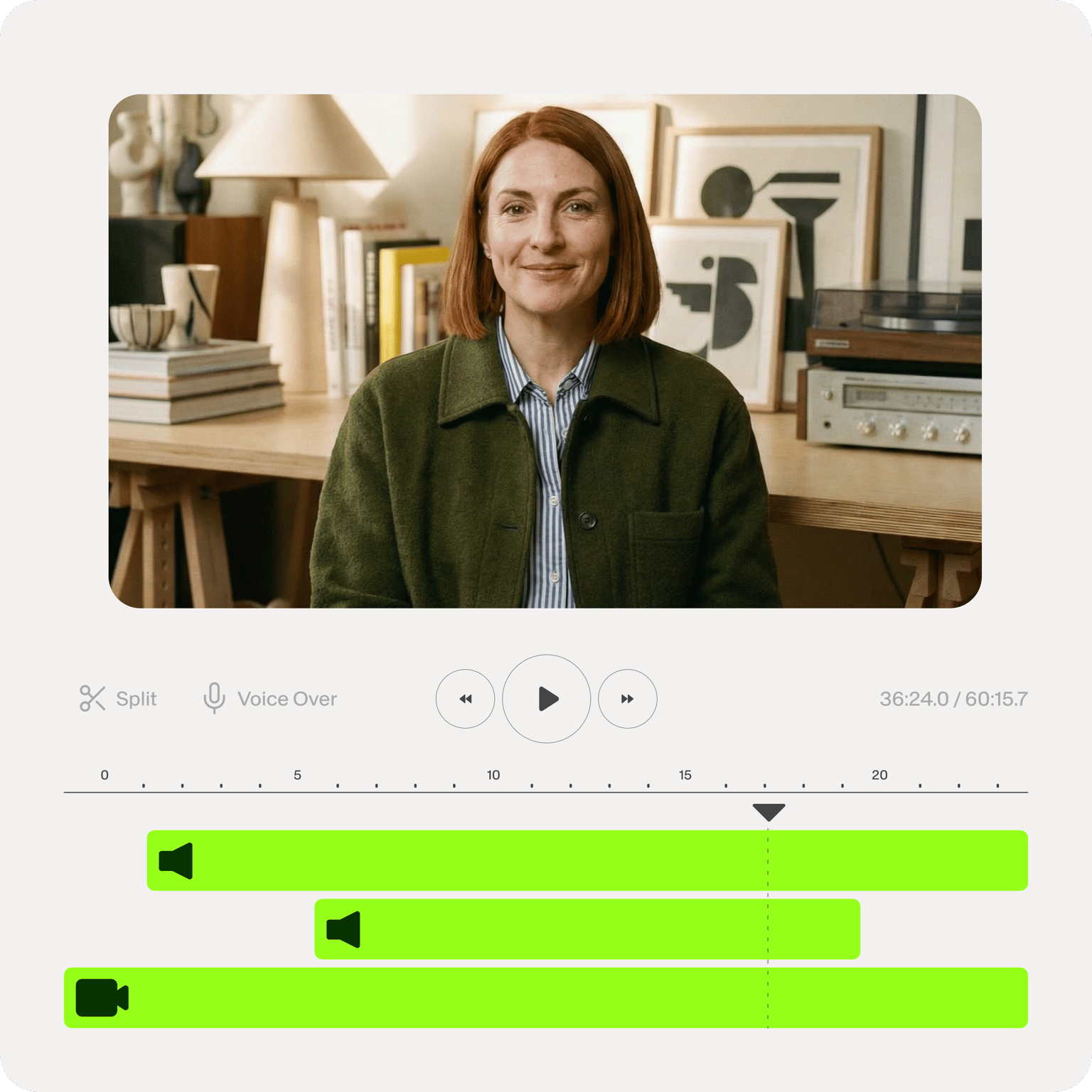 আপনি সহজেই আপনার মিউজিক শুরু ও শেষের সময় সিলেক্ট করতে পারেন। ভয়েস ওভার, মিউজিক ইত্যাদি যুক্ত করার জন্য আপনার ভিডিওতে ভিন্ন ভিন্ন অডিও ট্র্যাক যুক্ত করুন। আমাদের টাইমলাইন আপনার অডিও ক্লিপ ছোট করে কাটা, আপনার ভিডিও রেকর্ডিংগুলো থেকে অডিও সরানো এবং ভিন্ন ভিন্ন লেয়ারে অনেকগুলো ট্র্যাক পুনরায় সাজানোর কাজটি অনেক সহজ করে দেয় (এমনকি আপনার ভিডিওতে একই সময়ে দুই অডিও ট্র্যাক প্লে করুন)! VEED এর মাধ্যমে আপনি আপনার ভিডিও প্রজেক্টটি (আইফোন/আইপ্যাড আইওএস বা যে কোন প্লাটফর্ম থেকে) সবদিক দিয়ে উপযুক্ত করে তুলতে পারেন।