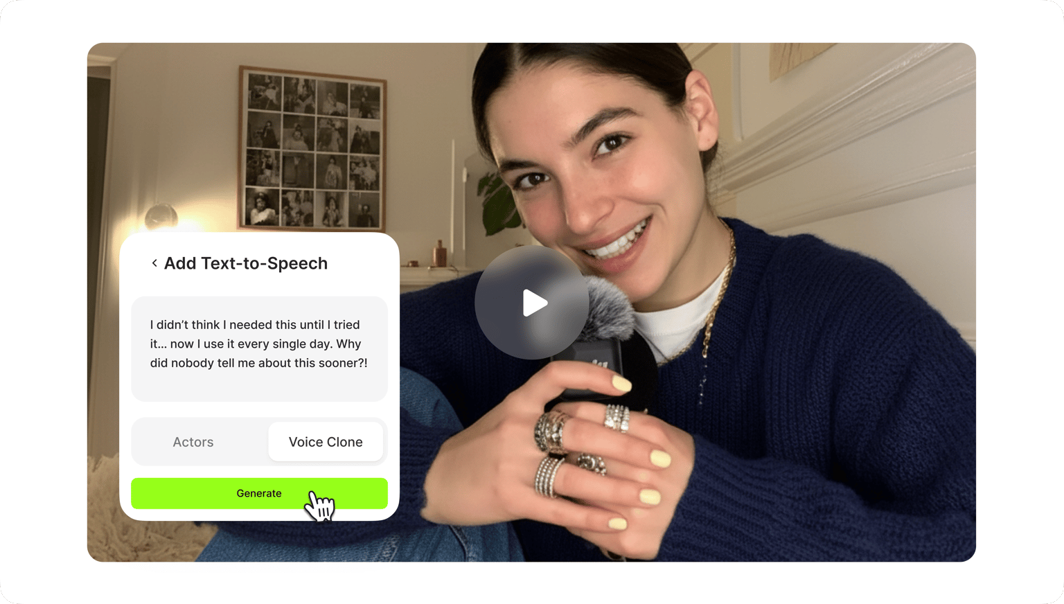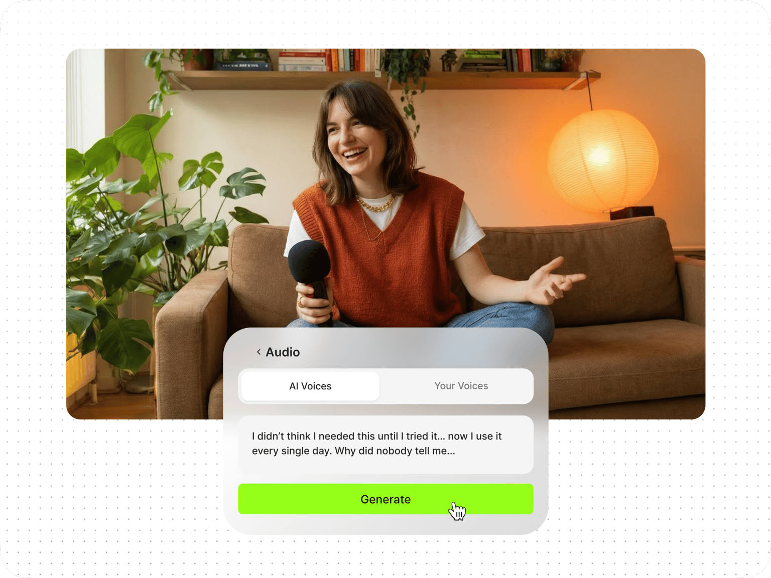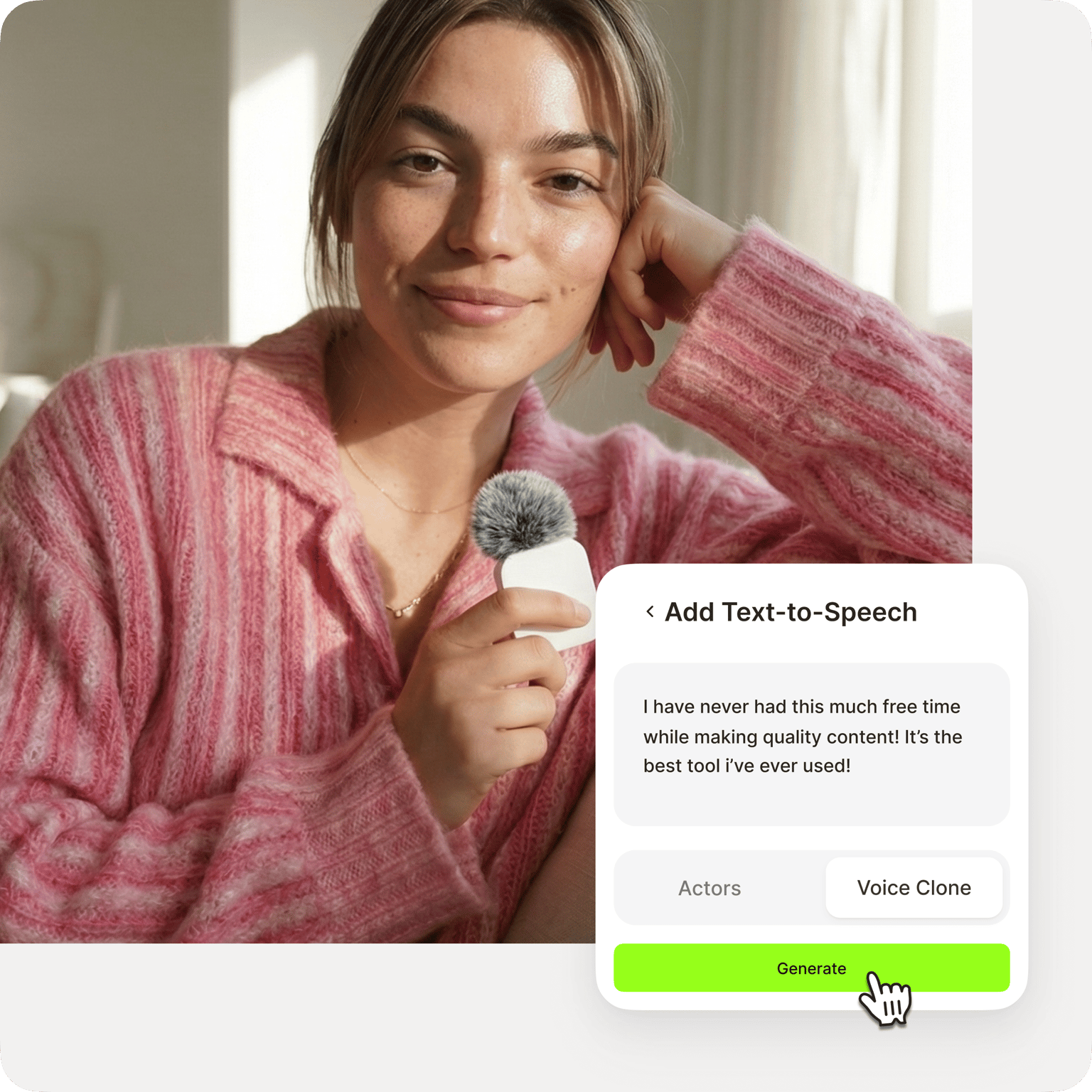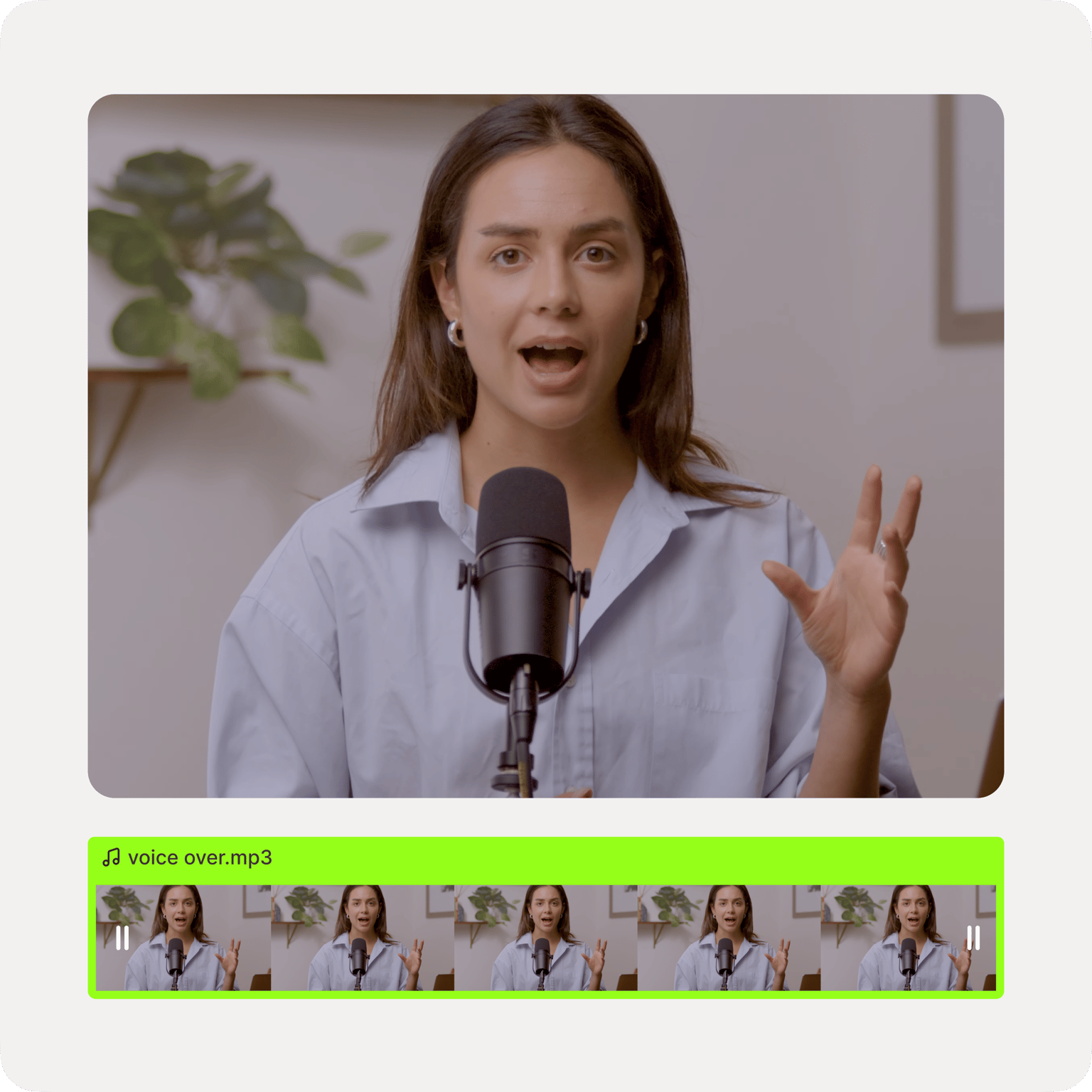আপনার প্রজেক্টে আপনার ভয়েসওভার যোগ করুন। আপনি একটি ভিডিও তৈরি করতে পারেন, আপনার ক্লোন করা ভয়েসের সাথে অডিও ফাইল এক্সপোর্ট করতে পারেন, অথবা আমাদের AI ভিডিও টুলগুলিকে অন্বেষণ করতে থাকুন যেন আপনি সর্বোত্তম সামগ্রী তৈরি করতে পারেন।
