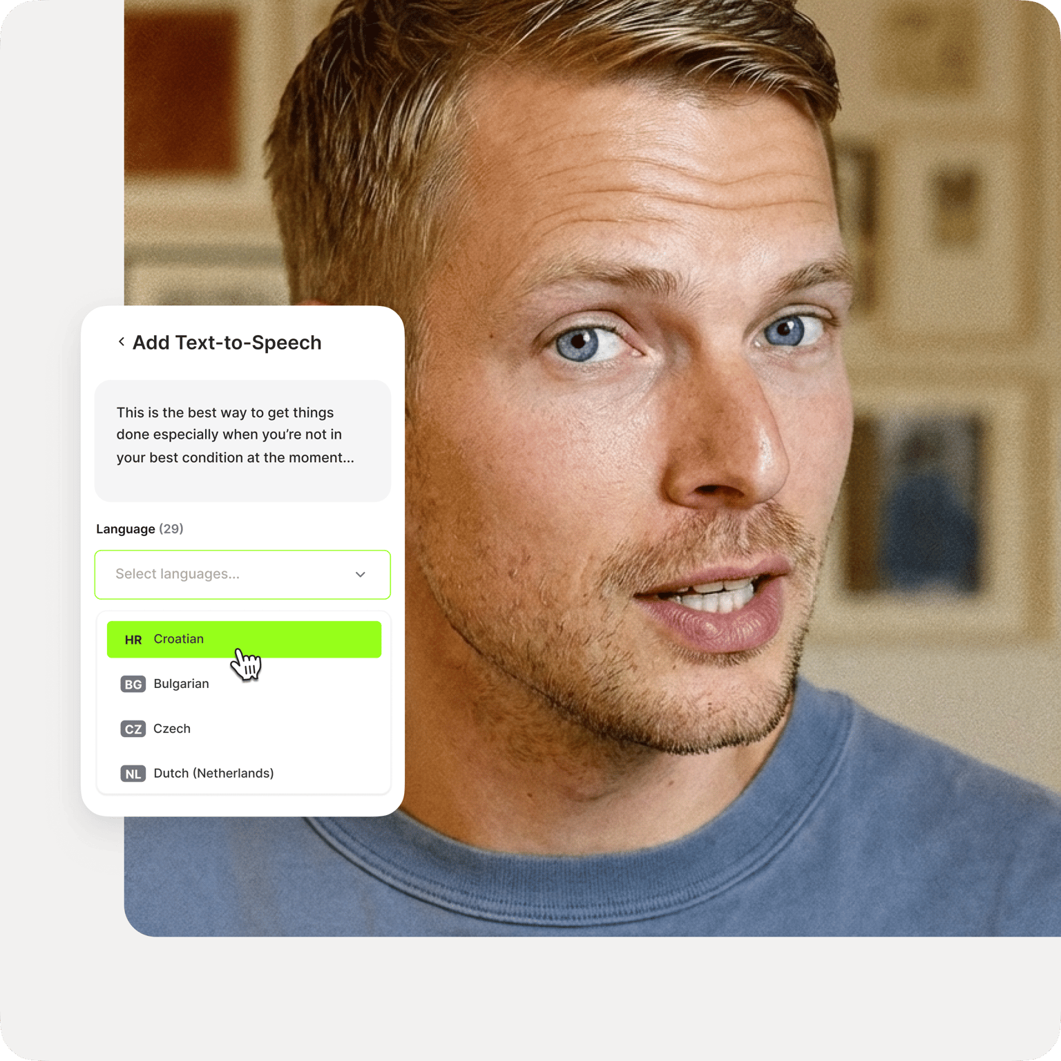 আমাদের AI ভয়েস ক্লোনার ব্যবহার করুন আপনার ভয়েস নকল করতে এবং সমস্ত ধরণের যোগাযোগের জন্য ভয়েসওভার সহ ভিডিও সামগ্রী তৈরি করতে। অভ্যন্তরীণ যোগাযোগের ভিডিও, শিক্ষামূলক সামগ্রী, এবং আপনার টিমের জন্য প্রেজেন্টেশন ভিডিও তৈরি করুন। আপনাকে মাত্র একবার আপনার ভয়েস রেকর্ড করতে হবে। আমাদের টেক্সট-টু-স্পিচ সফ্টওয়্যার আপনার ভয়েসের গুণমান ধরে রাখতে ডিপ লার্নিং ব্যবহার করে, তাই আপনি এটি সমস্ত প্রকল্পে ব্যবহার করতে পারেন।