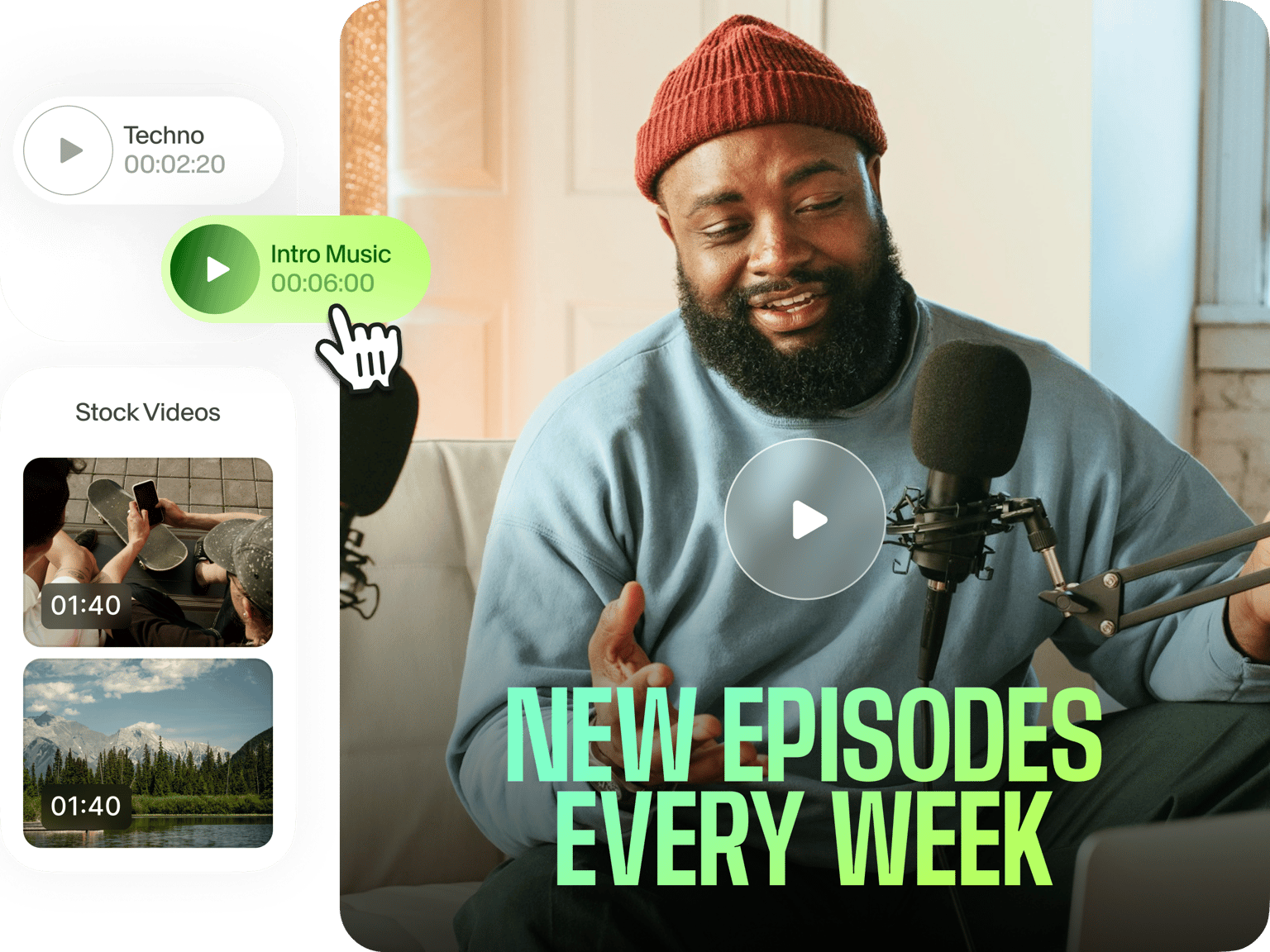 Create podcast intro videos in a few clicks, free up time for conceptualizing and recording great podcast episodes. Have some background noise in your recording? With VEED, you can also quickly clean up your audio and achieve studio-quality sound with a click of a button.