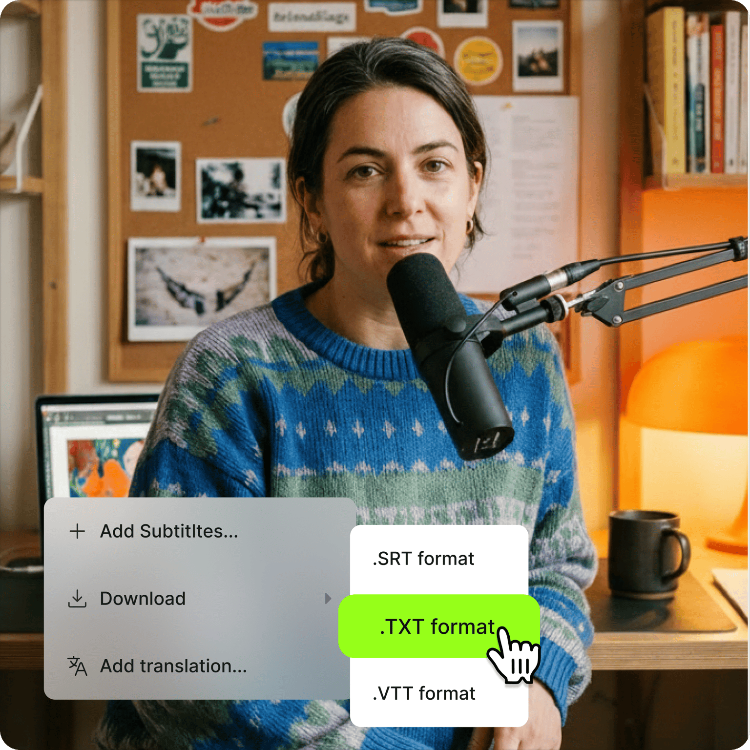 Sie können Ihre Übersetzungen als Untertiteldateien herunterladen. Exportieren Sie als SRT- oder TXT-Datei. Oder Sie können die Untertitel in Ihr Video „brennen“. Das bedeutet, dass die Untertitel dauerhaft fest in das Video codiert werden. Es macht Ihre Inhalte einem globalen Publikum zugänglich. Es ist super einfach zu machen. Klicken Sie, ohne die Untertitelseite zu verlassen, auf Optionen. Wählen Sie Ihre bevorzugte Sprache, wählen Sie das Untertitelformat und klicken Sie auf die Schaltfläche Herunterladen. Sie können Ihre Untertitel als VTT-, SRT- oder TXT-Datei exportieren.