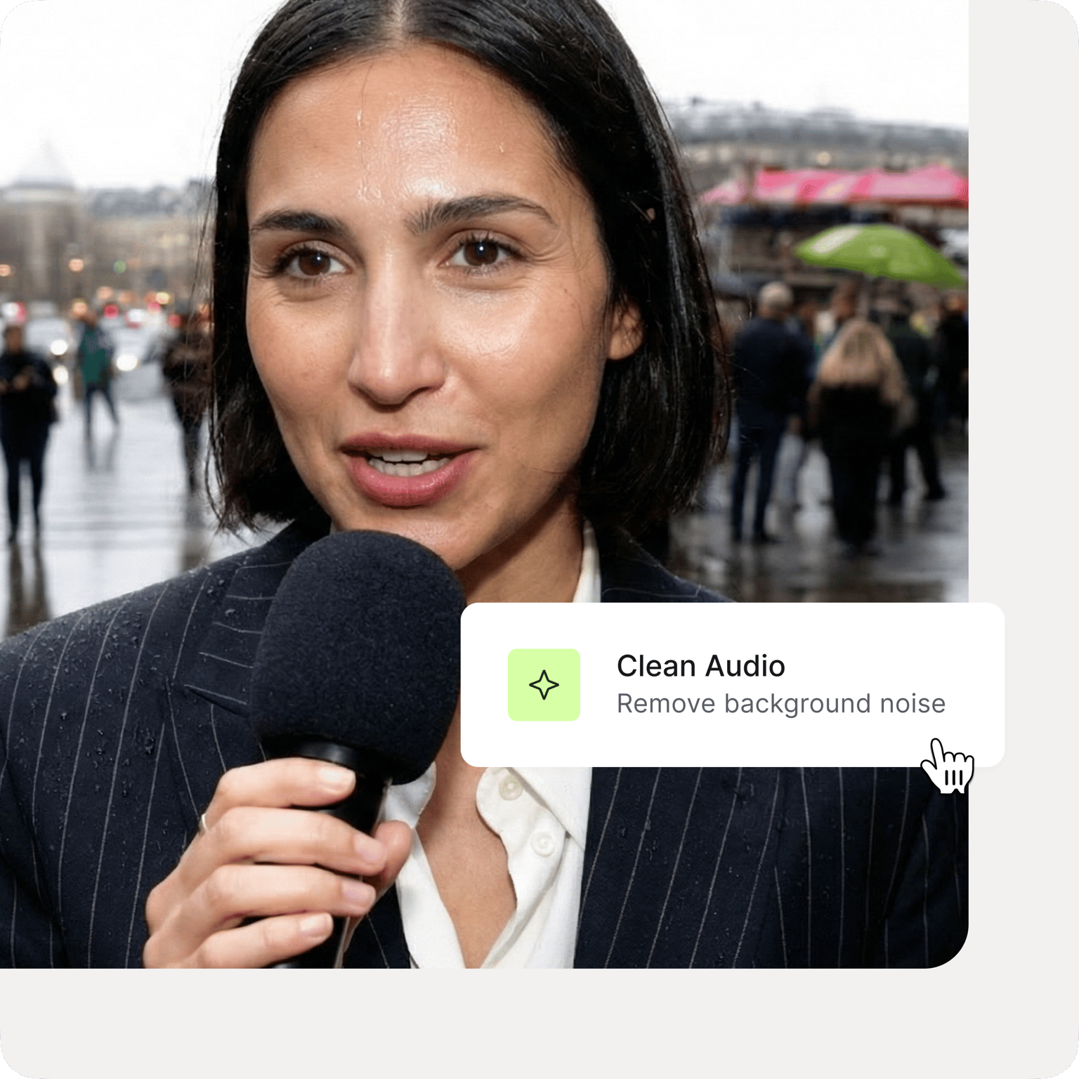 Λειτουργεί με βίντεο - Μπορείτε επίσης να ανεβάσετε αρχεία βίντεο - MP4, AVI, WMV, MOV κ.λπ.- για να αφαιρέσετε το θόρυβο του περιβάλλοντος από τα βίντεό σας. Απλώς ανεβάστε τον ήχο σας, ανοίξτε τις Ρυθμίσεις, κάντε κλικ στο κουμπί "Καθαρισμός ήχου" και ορίστε - ο θόρυβος του περιβάλλοντος θα εξαφανιστεί αυτόματα. Με ένα ευέλικτο εργαλείο όπως το VEED, η αφαίρεση του θορύβου του περιβάλλοντος από το ψηφιακό σας περιεχόμενο είναι ευκολότερη από ποτέ!