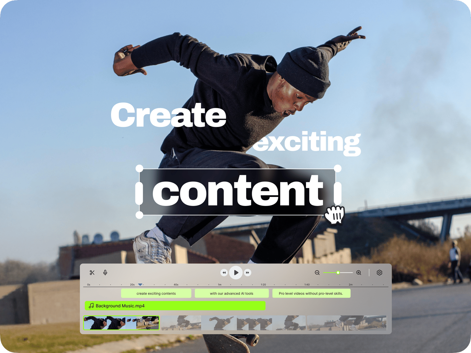 En el editor puedes añadir texto, añadir audio, quitar audio, añadir subtítulos automáticamente, redimensiona, rotar, añadir filtros, efectos ¡y mucho, mucho más!