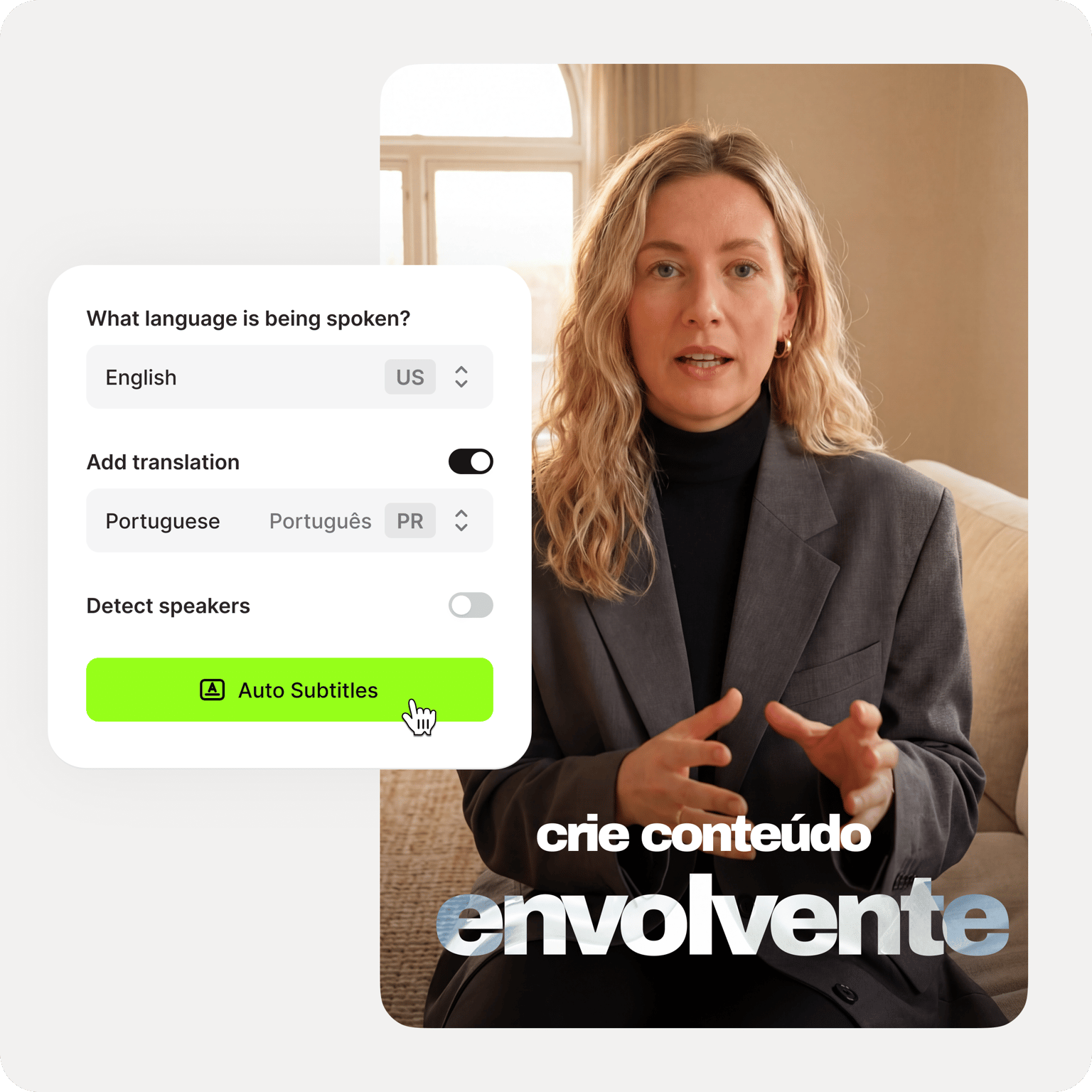 השתמש ב- VEED כדי לתרגם כתוביות מכל שפה לכל שפה. פשוט העלה את קובץ ה- SRT שלך או תרגם ישירות מקובץ הוידאו או השמע. אין צורך לבזבז שעות בתרגום ידני של תמלילים. עם VEED, זה לוקח רק כמה דקות. לכלי המקוון שלנו למתרגם ועורך כתוביות יש דיוק של 95%. אל תשתמש ב- Google Translate שלפעמים יכול להיות לא מדויק. אתה יכול אפילו ליצור אוטומטית כתוביות מסרטוני YouTube ולתרגם את הכתוביות לכל שפה. אין צורך להוריד סרטון YouTube בנפרד. פשוט הדביקו את הקישור בעורך של VEED, בשדה כתובת האתר, ו- VEED יכין את הסרטון לעריכה. צרו כתוביות באנגלית ותרגמו אותן לספרדית, צרפתית, יוונית, ברזילאית, פורטוגזית ועוד.