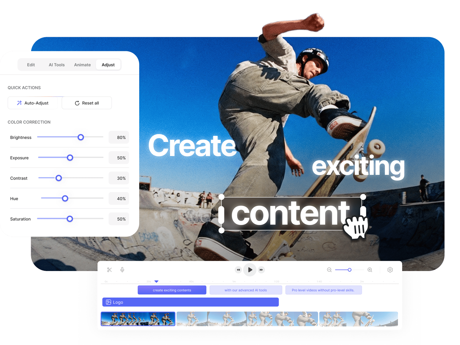 もうFinal Cut Pro Xやavidemuxのような高価で複雑なソフトウェアは必要ありませんし、プロの動画制作チームを個別に雇う必要もありません! オンライン動画メーカーを使えば、あなたのビデオ映像、音声ファイル、画像、アニメーションを、プロフェッショナルで魅力的な動画コンテンツに変えることができます。簡単に操作できるアプリの編集機能には、色調整、色調補正、ビジュアルエフェクトが含まれます。オーディオトラックの編集、ロゴメーカー、スライドショーメーカー、アニメーション機能(動画に注釈を付けるなど、近日公開予定!)も利用可能です。動画をアップロードするか、サンプル動画のテンプレート(ストック動画)を使用して、すぐに始めることができます。VEEDは、あなたの指先にパワーを与える無料の動画エディタであり、信じられないほどのビデオ作成機能を提供します。