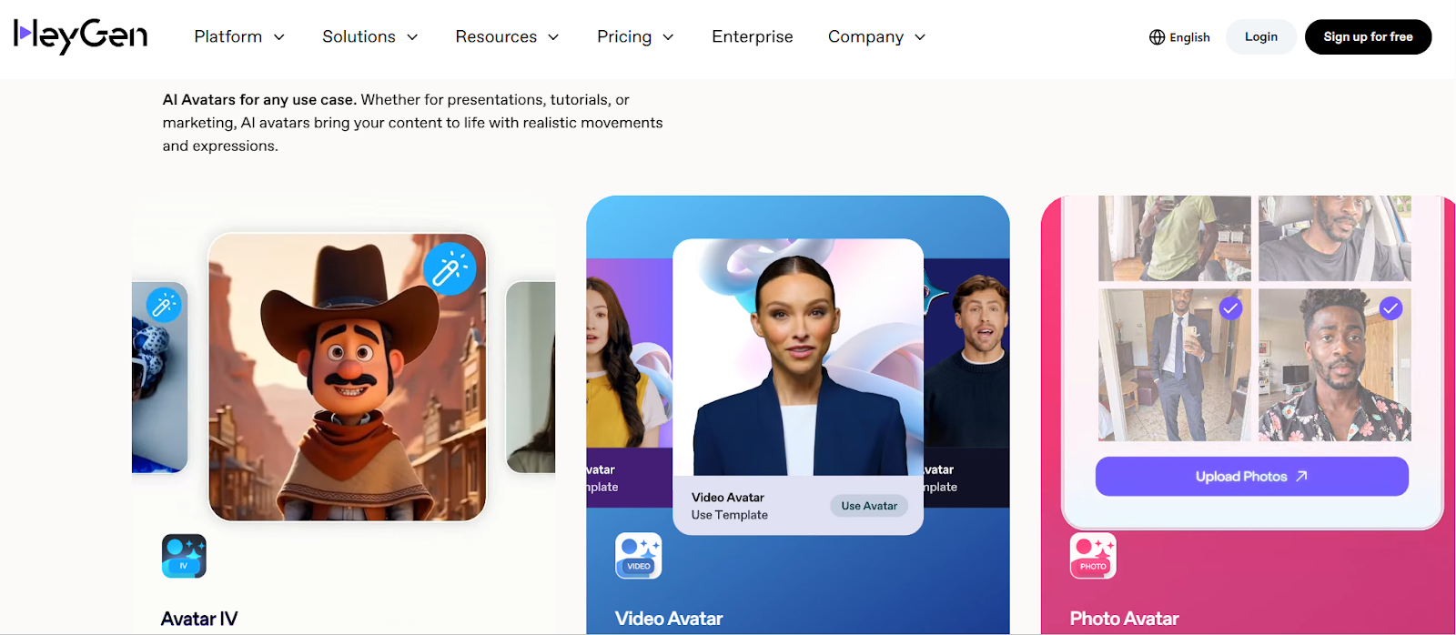 HeyGen offers multiple avatar types. Avatar IV turns a single photo into lifelike, realistic talking avatars. Talking Photo (Photo Avatars) brings still images to life by making them talk naturally.