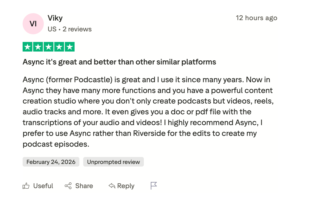 Async is ideal for creators and teams who want an integrated platform for producing, editing, and repurposing audio and video content. It works particularly well for podcast creators, marketing teams, and educators who regularly turn long recordings into multiple content formats such as clips, social videos, or transcripts.