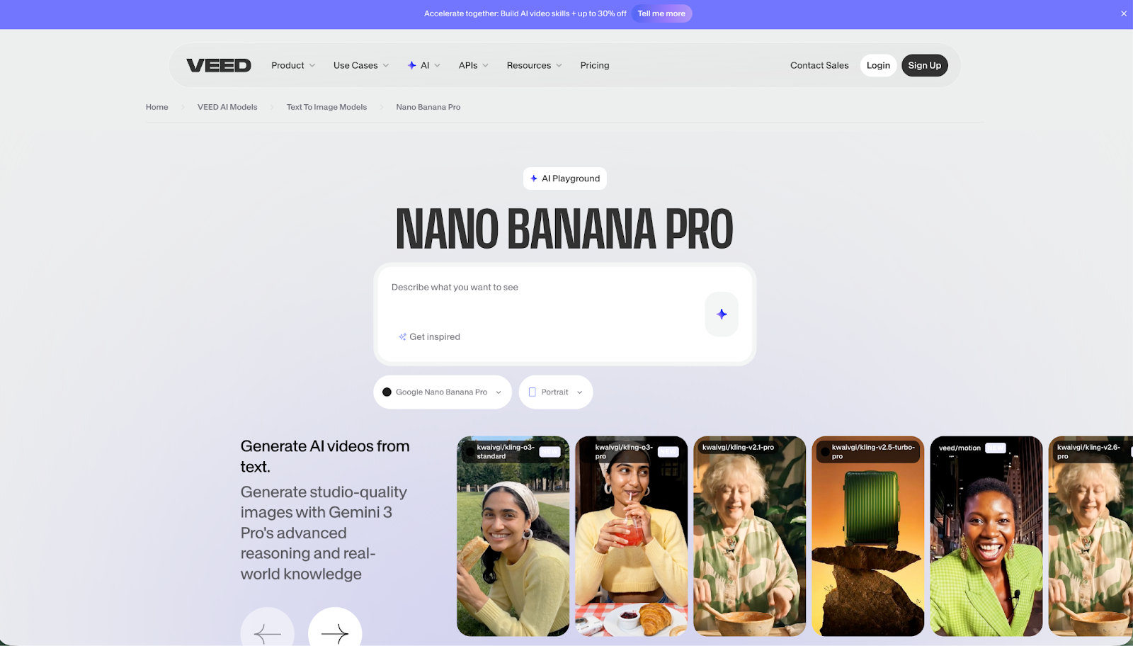 VEED also integrates multiple AI image models into a single platform, so you're not stuck with a single generator's quotas or limitations. Use Nano Banana for fast drafts, Pro for polished assets, then bring everything into VEED to finish the job: subtitles, voiceovers, brand kits, the works.