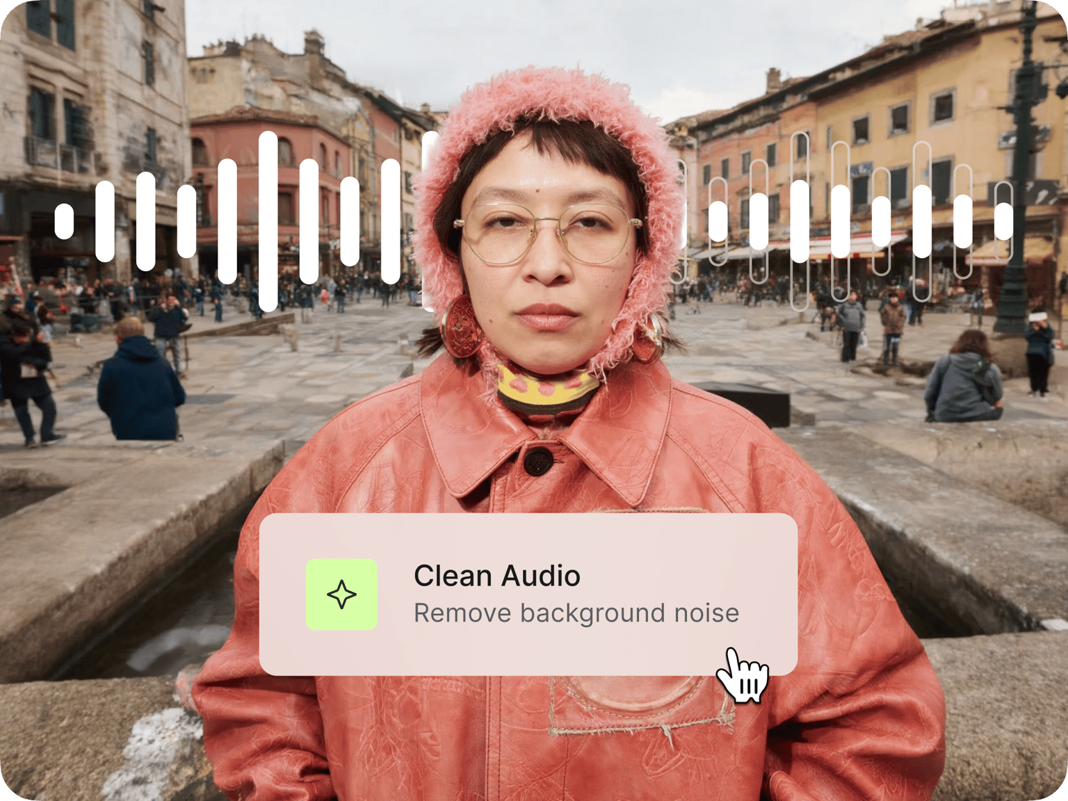 Couldn't find a quiet place to record? Or finally got the perfect take, only for traffic sounds to ruin it? Our AI voice cleaner isolates and clarifies your voice, removing distracting sounds so your message comes through clearly. No need for retakes and manual cleanup.