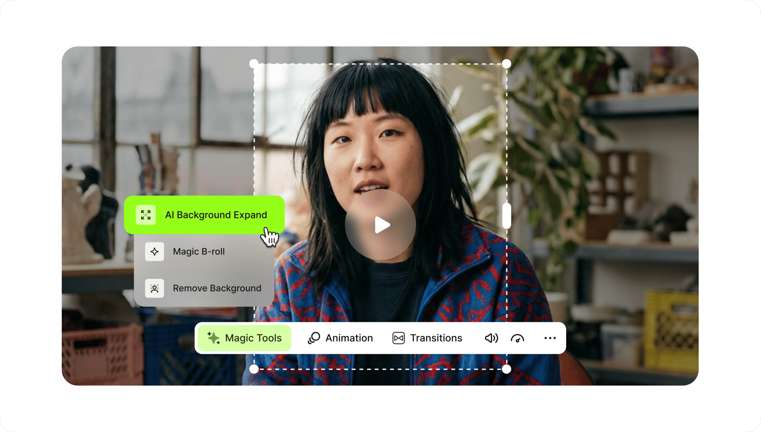 AI Background Expand is just one of our many tools that enhance your video. Explore more Magic Tools on VEED. Clean Audio removes background noise to make your audio sound professional. AI transitions creates eye-catching scene morphs. And Magic B-roll generates supplemental images for your spoken topics. You get all these AI-powered tools in one place. Create professional videos in minutes. Start creating now.