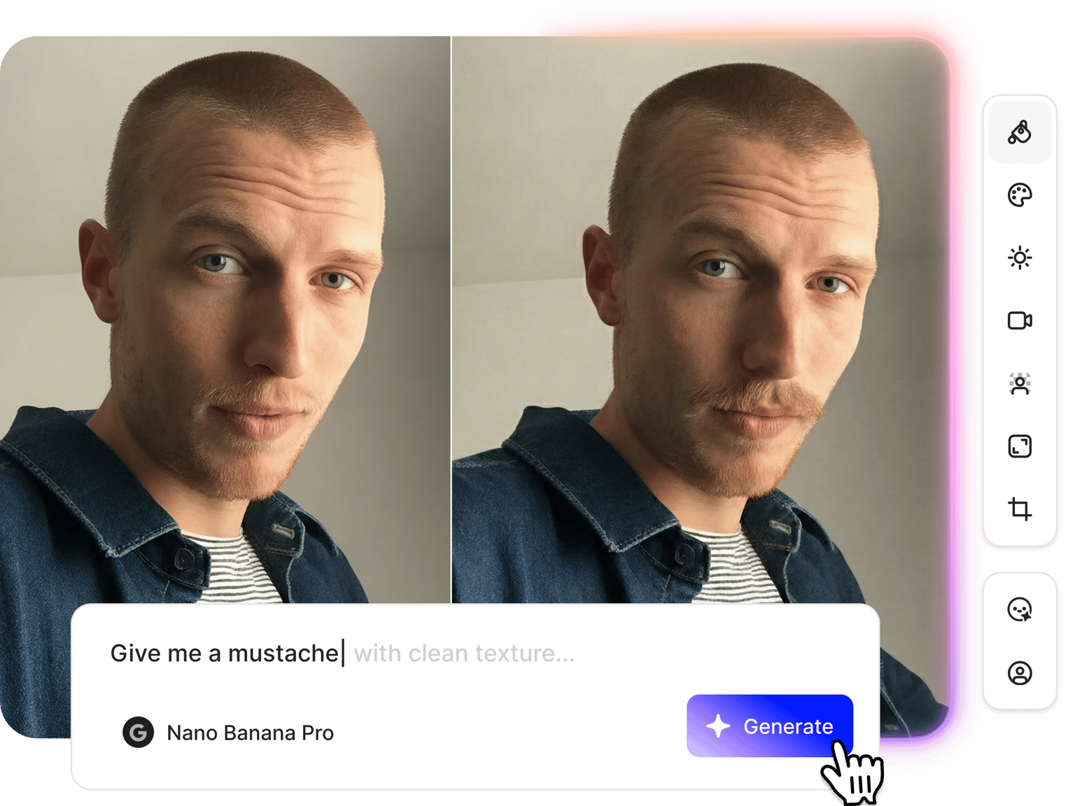 Content creators can use VEED's mustache generator to build distinctive characters and brand personas. Try different facial hair combinations on a base photo, compare results, and develop a look that works for your content. Starting from an idea rather than an existing image? Our image generator turns your ideas into character designs.