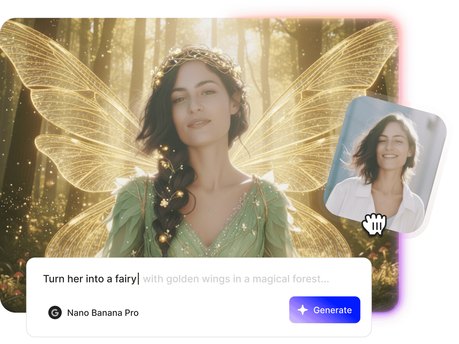 Transform your photos into fairy AI art or generate fairy images from text prompts. Add wings, magical glows, and enchanted backgrounds