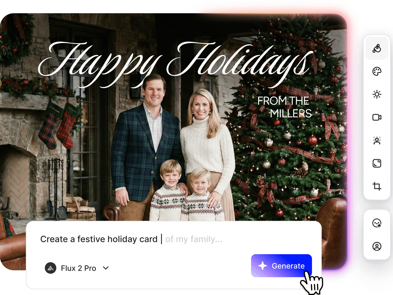 Create greeting cards from your photos or generate designs from scratch. Make personalized cards for any occasion, Christmas cards, and birthday greetings