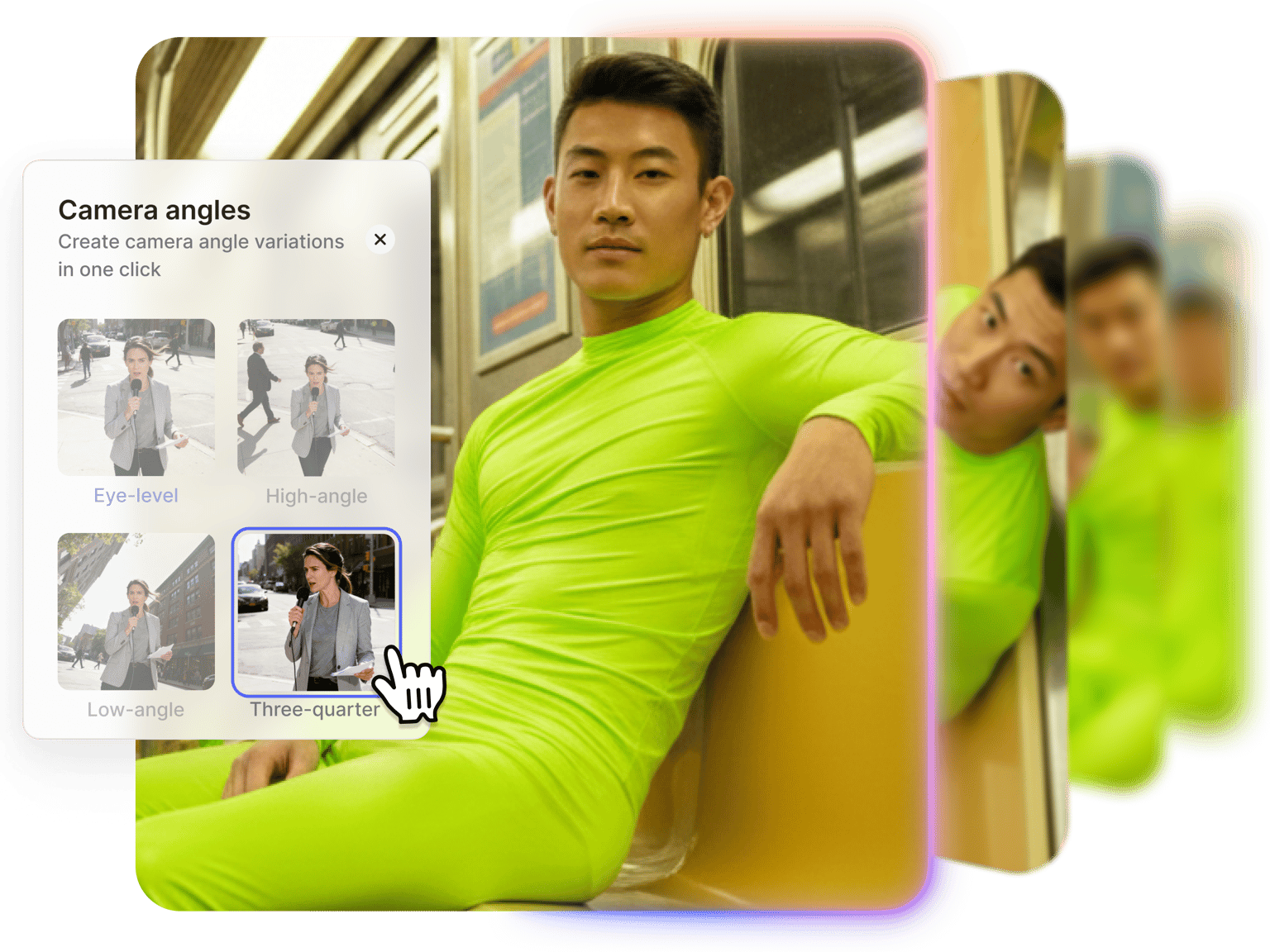 Select one of our presets to create an image variant in one click. Or type a prompt for more control over your image variations. Choose from filters to change colors, lighting, poses, and facial expressions. Type prompts to describe your changes: “change the background to a beach” or “add water droplets on the bottle.” Create AI image variants that match your vision.