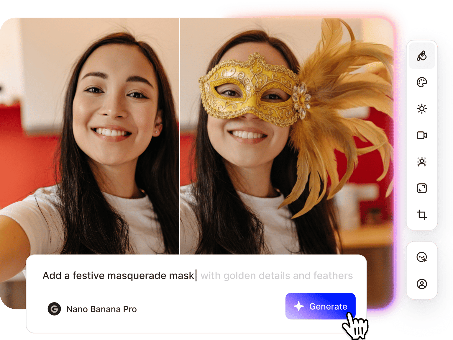 Upload portraits and apply masquerade mask designs for party photos and social media content. Create Venetian masks with elegant details, carnival masks with decorative elements, or masquerade designs with embellishments. Adjust mask colors, backgrounds, and styling. Perfect for masquerade party invitations, profile pictures, or creative social content.