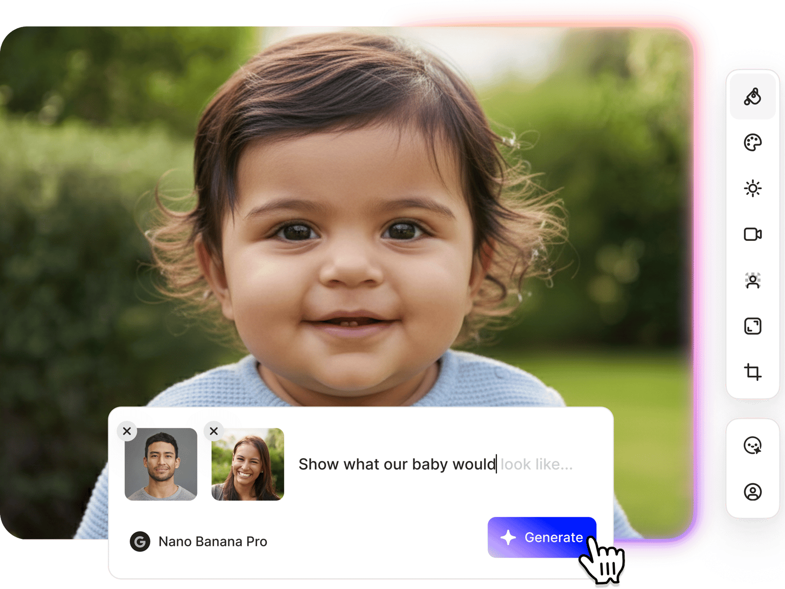Upload photos of two parents and let AI predict what your future baby will look like. VEED's baby face generator combines facial features from both photos to create realistic predictions of your baby's appearance. See potential eye color, facial structure, skin tone, and features your baby might inherit. Generate multiple baby face variations to explore different possibilities. The AI analyzes facial characteristics from both parents and blends them to create baby predictions. Create baby images for fun, curiosity, or family planning without complex editing or photo manipulation.