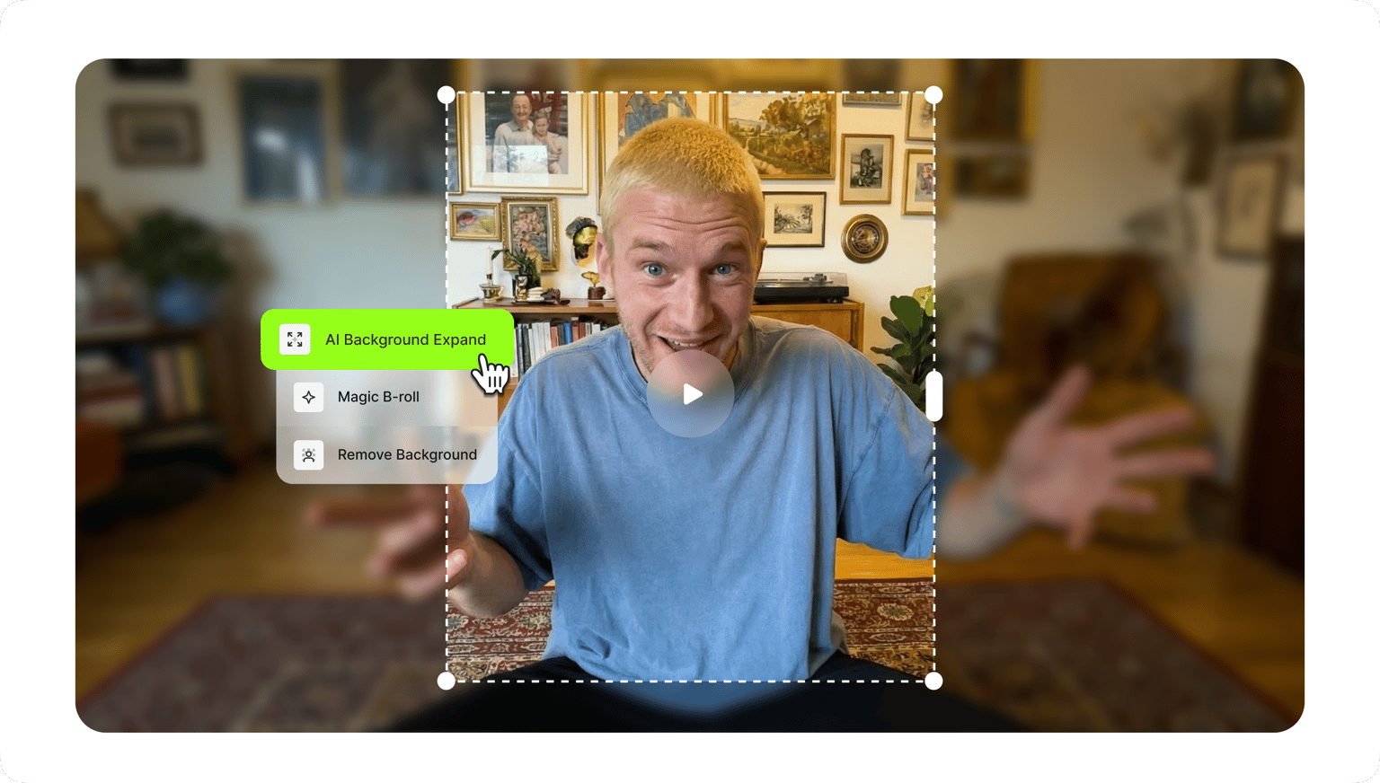 Need to expand video footage? VEED also offers AI background expand for video. Same outpainting technology but for moving footage. Extend video backgrounds up to 1 minute in length. Remove awkward black bars and repurpose vertical videos for landscape formats. You can also remove video backgrounds entirely and replace them with solid colors, images, or custom scenes.