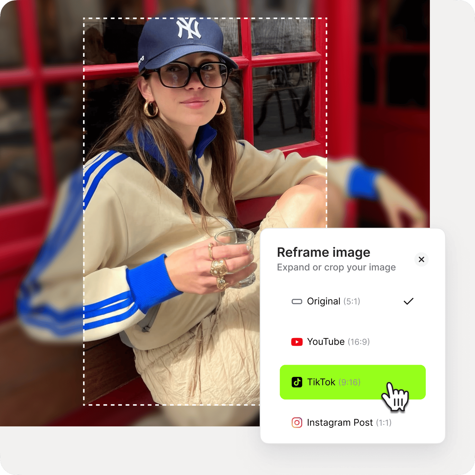 Resize images for any platform without losing your subject to cropping. Select platform presets for YouTube thumbnails (16:9), TikTok and Reels (9:16), Instagram posts (1:1), or LinkedIn (9:16). Or use general presets like tall portrait for vertical content, square for balanced framing, and wide landscape for cinematic shots. The AI expands your background to fit while keeping your subject intact.