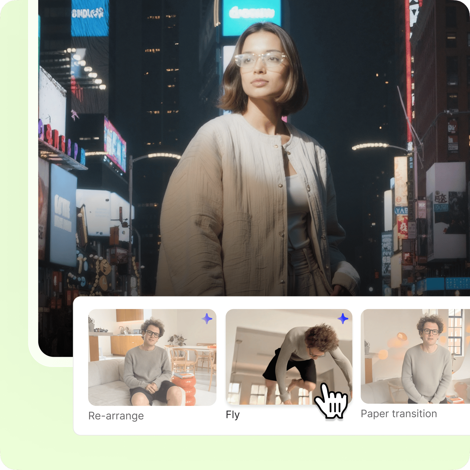 Pick from transition effects like Fly, Orbit, and Build for instant results. Or describe your own cinematic transition in plain text to create something unique that no stock library could offer.