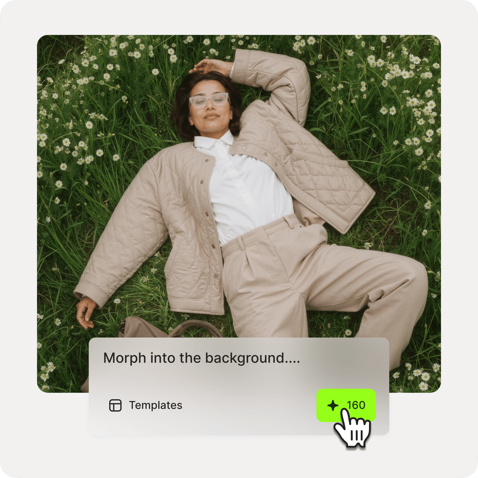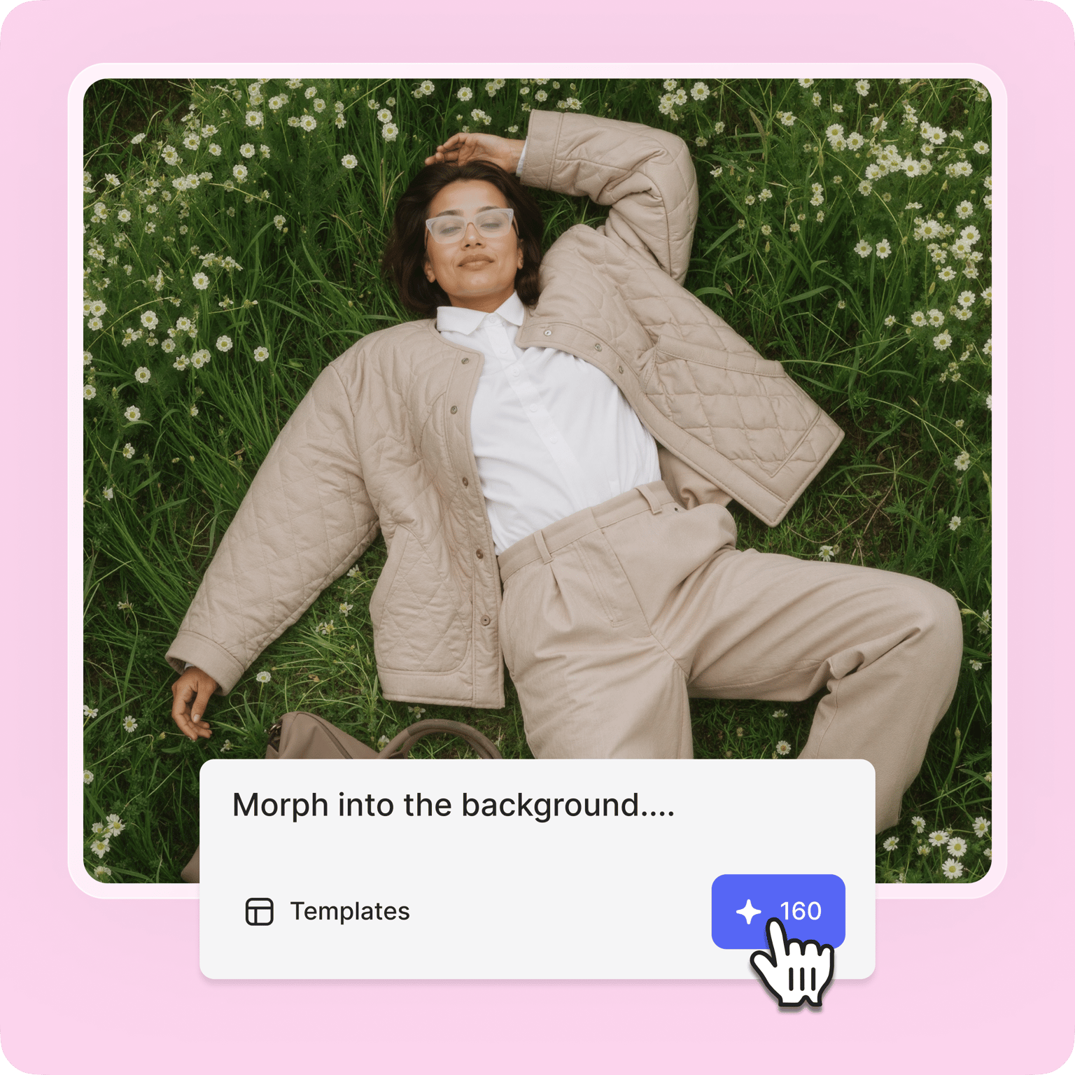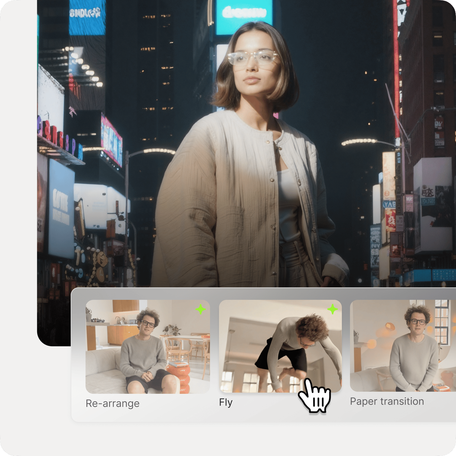 Create cinematic transitions from presets or custom prompts. Explode onto the screen, fly between locations, zoom in, and more