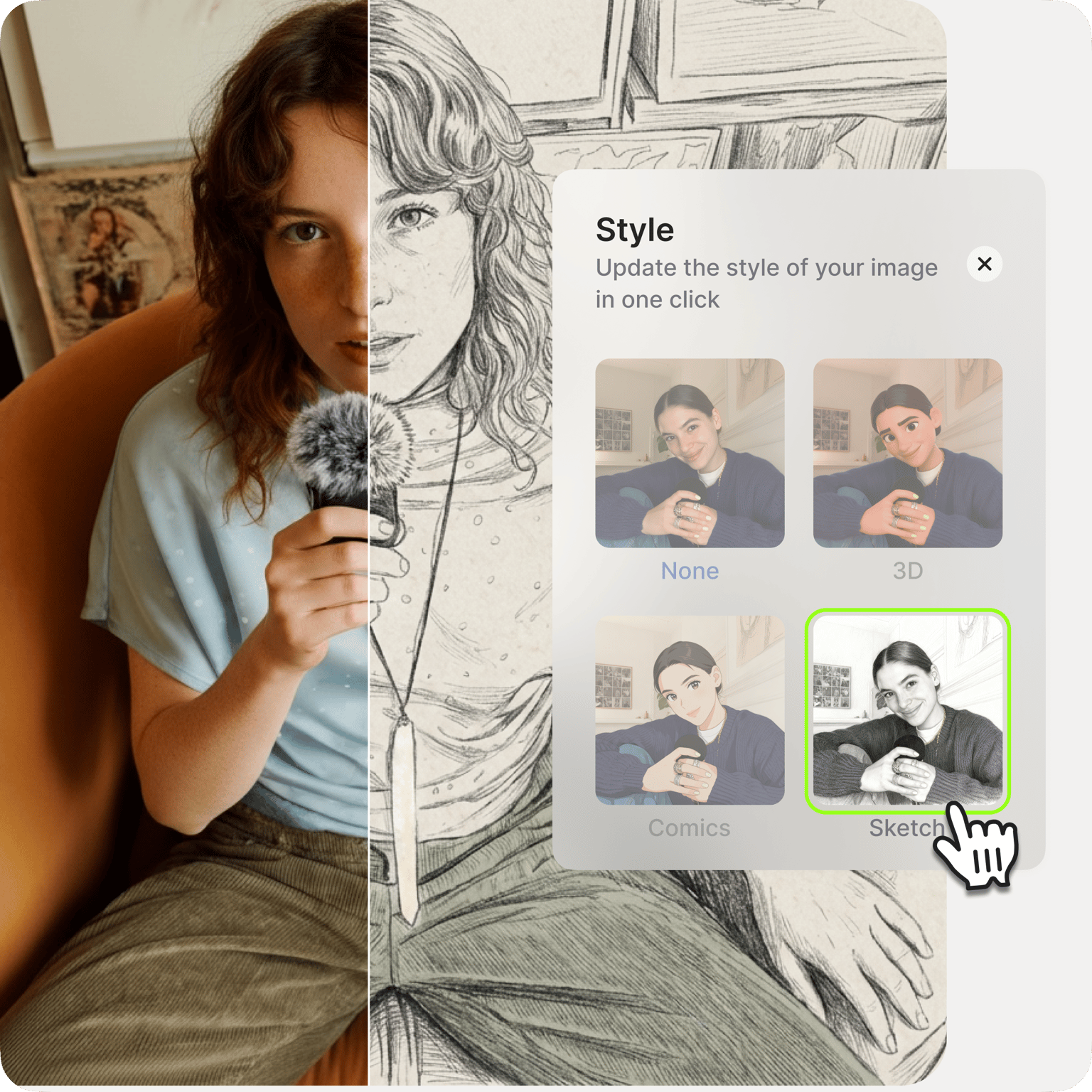 Select an AI model and type what you want to see. ‘Turn this into anime style.’ ‘Apply oil painting.’ ‘Restyle as cyberpunk illustration.’ You can also select one of our style presets.