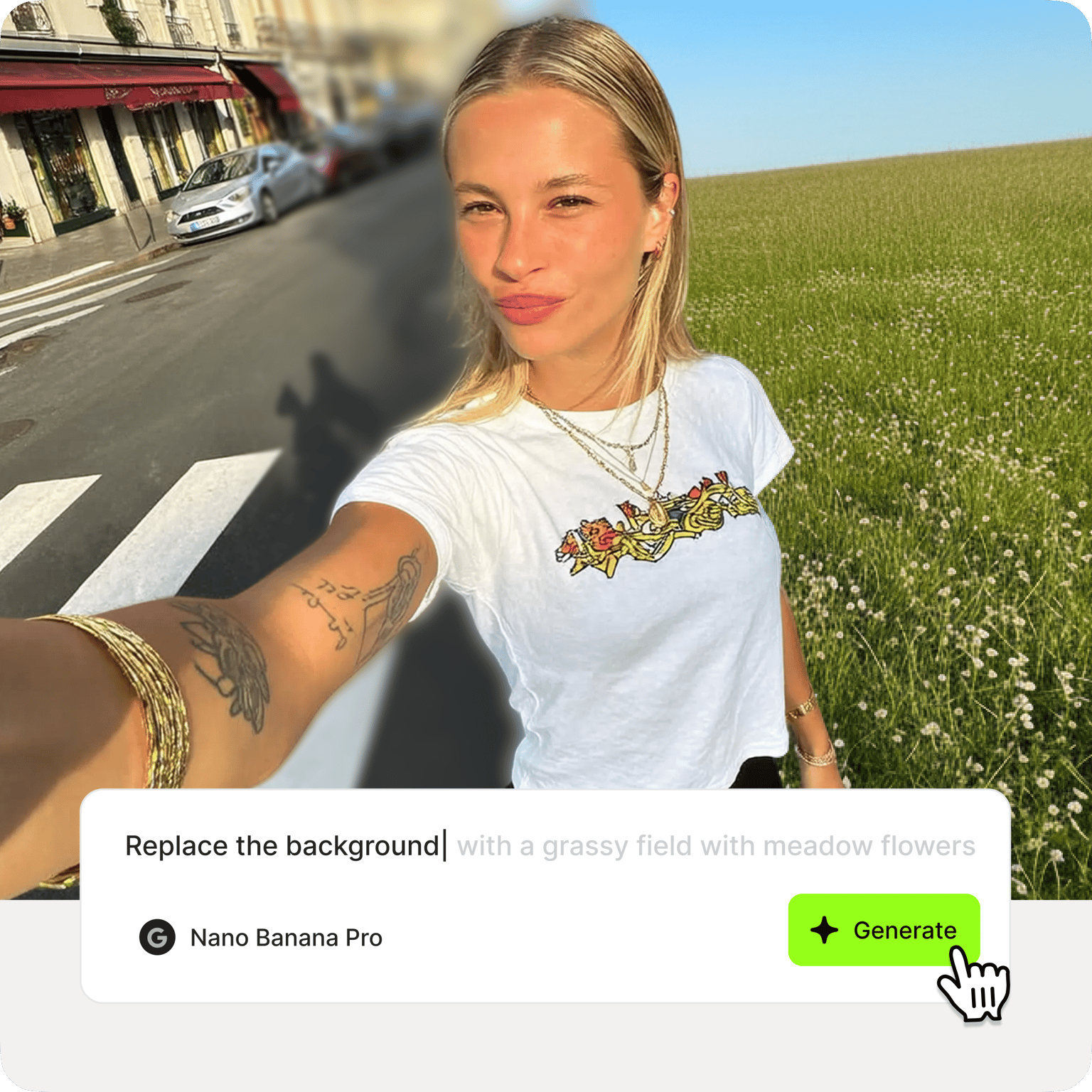 VEED is more than a standalone photo upscaler. Once your image is enhanced, use the AI image editor to remove distracting objects, change background colors, and even rewrite text in graphics. No need to export and transfer platforms.