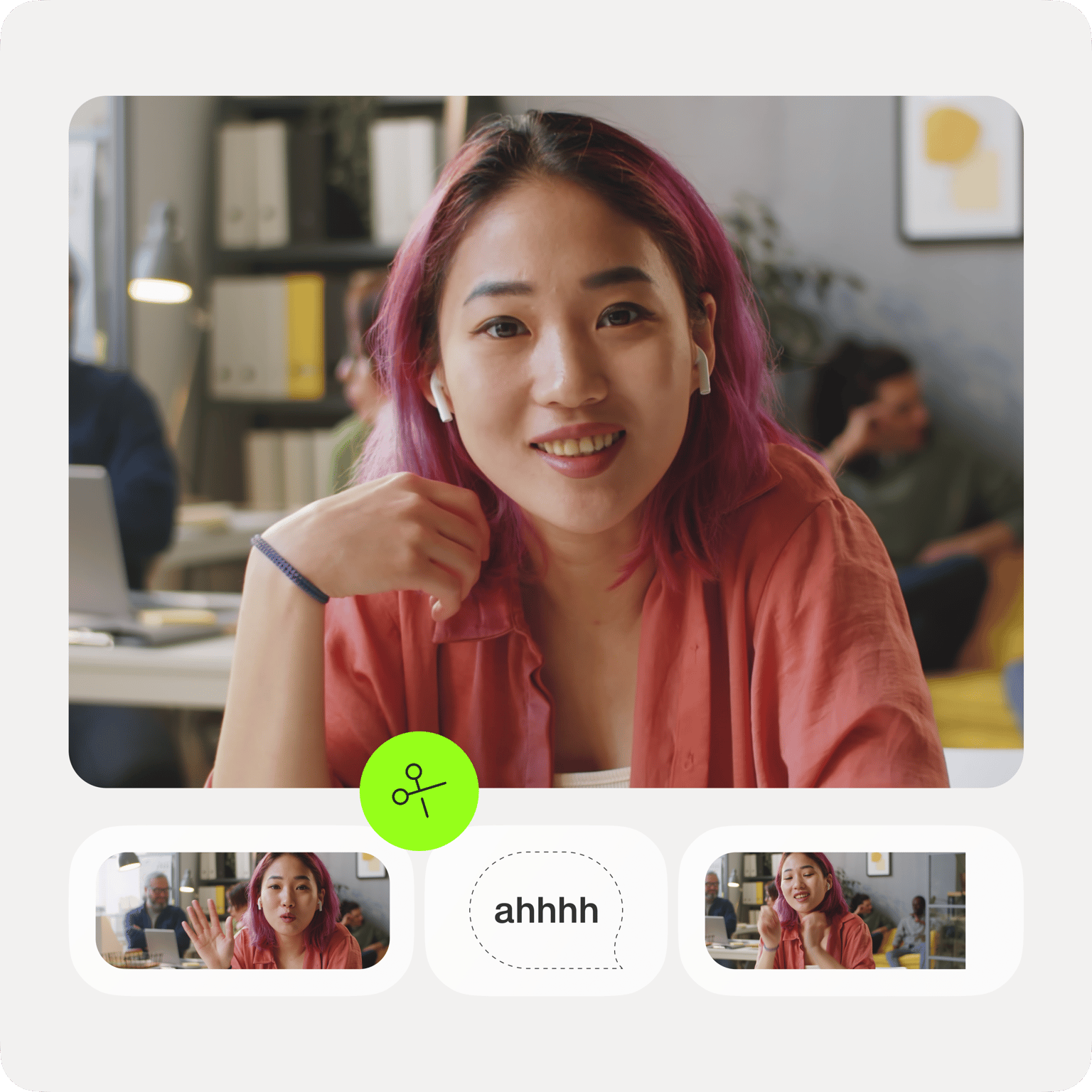 Clean up videos in seconds with our intelligent AI tools. One click removes all "ums" and "ahs." You can also remove silences; Set how long a pause needs to be before our AI removes it automatically. This feature removes dead air while keeping natural breaks. Want to save even more time? Our AI clip generator identifies your most engaging moments and turns them into social-ready clips—no manual selection needed. All these tools work right in your browser. No need to download software.