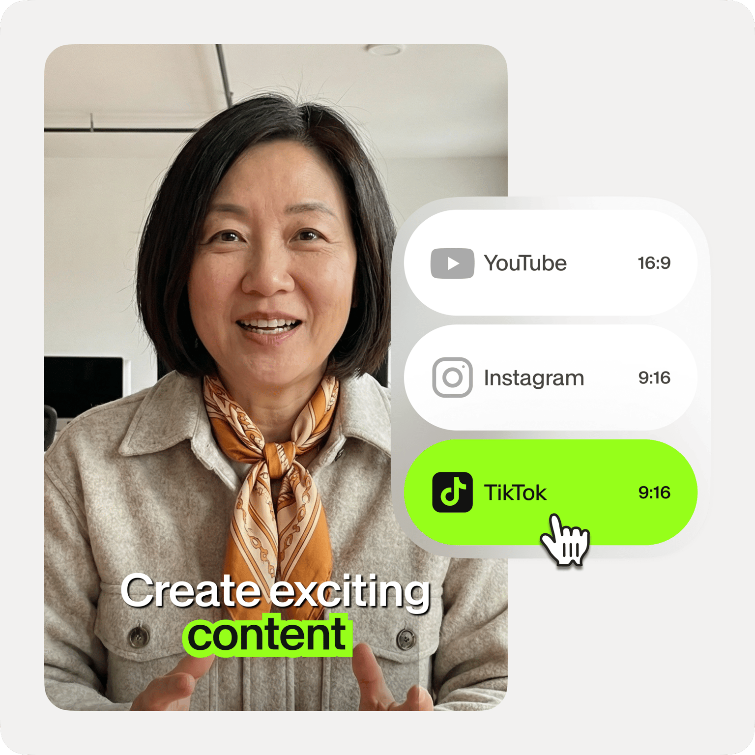 Text-based editing makes finding shareable moments ridiculously simple. Just scan your transcript for key points instead of watching the entire video again. Select any section, export it as a standalone clip, and you're ready to post. Resize automatically in any format, such as Instagram Stories or YouTube Shorts. Add eye-catching captions for sound-off viewing and maintain brand consistency with saved colors, fonts, and logos. Create a week's worth of content from one lengthy recording.