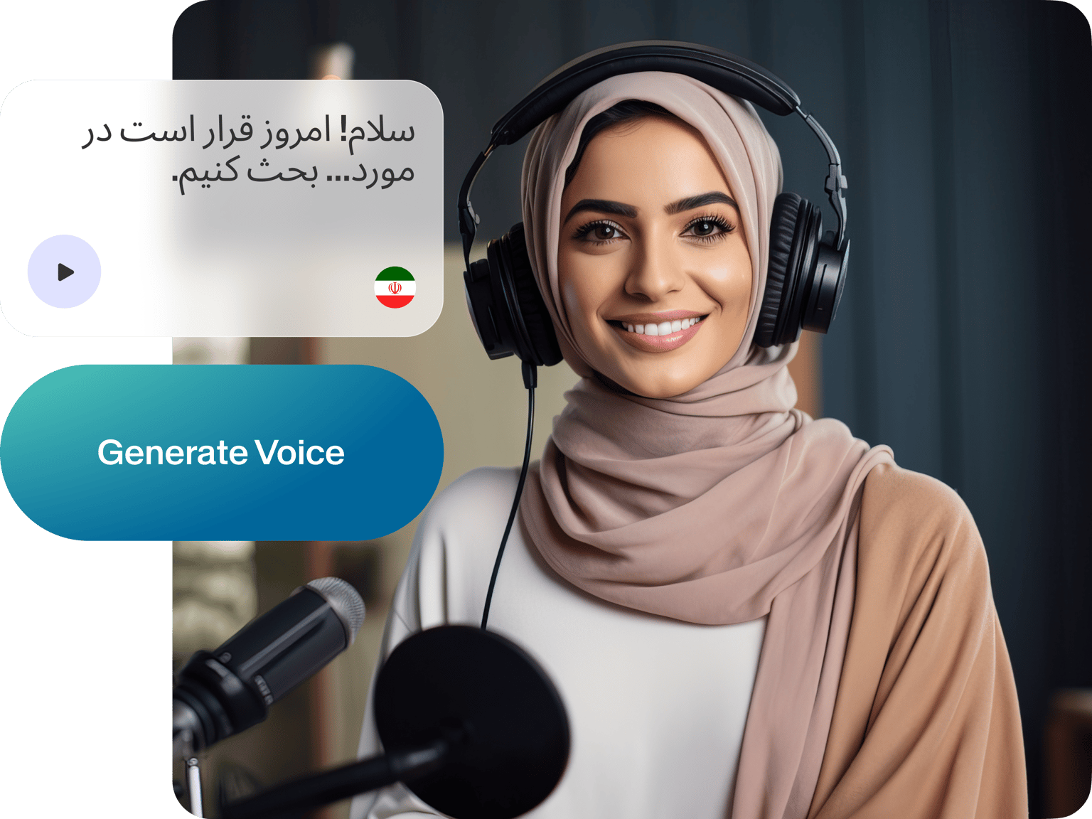 Experience unparalleled precision with our Persian TTS technology. VEED features state-of-the-art algorithms to ensure that every word, intonation, and expression is delivered flawlessly. Choose any male or female voice from our selection. Say goodbye to robotic voices and embrace the future of authentic Persian speech synthesis.
