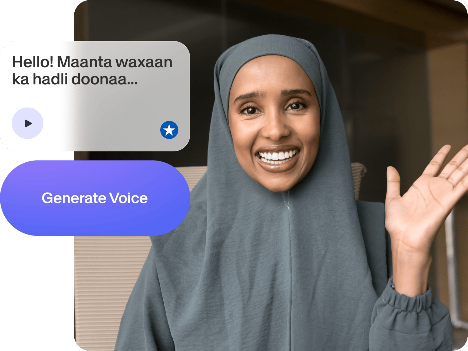 VEED’s powerful AI text-to-speech tool can produce automatic voiceovers in a Somali voice and 100 other languages. Our Somali online text-to-speech app features state-of-the-art speech recognition to ensure flawless delivery of every word, intonation, and expression.