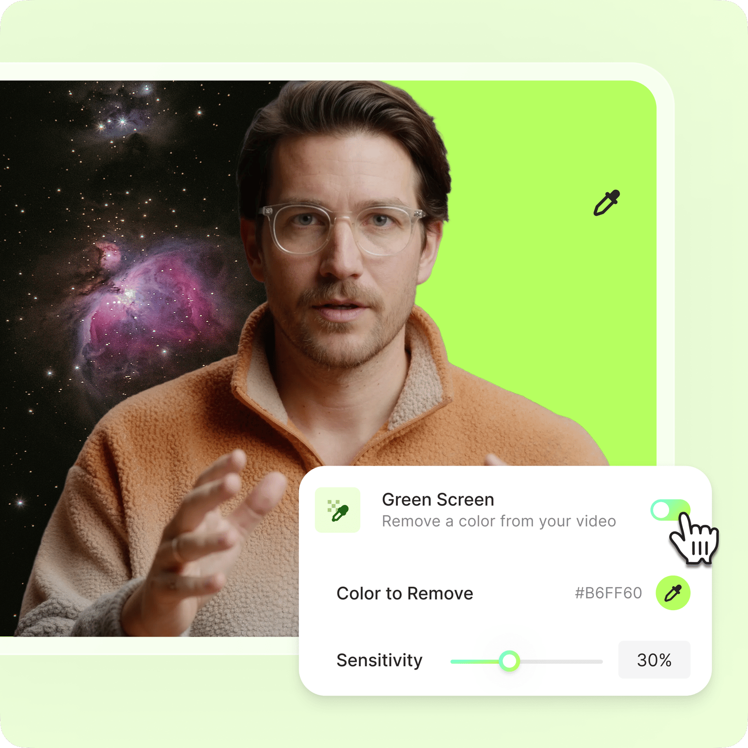 Already filmed with a green screen? VEED makes green screen removal just as easy. Use our webcam recorder to film your green screen video straight from your browser, then toggle on the Green Screen option to remove the background instantly. No need to spend hours on frame-by-frame editing. Remove green screens in one click and swap them with your custom backgrounds. Create product demos, tutorials, and branded content.