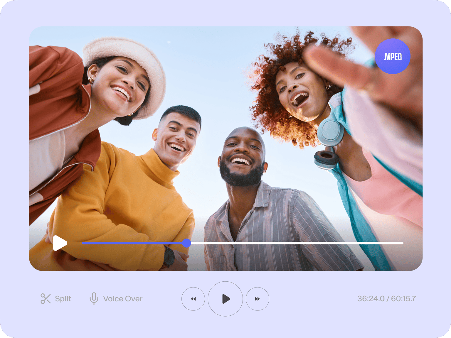 Play MPEG files effortlessly online without downloading software. VEED’s free MPEG video player makes it easy to share your videos with your audience. No need to send large files via email or have viewers download them to play on VLC or other media players! Simply upload your MPEG video to VEED, edit the video as needed, and share the link.