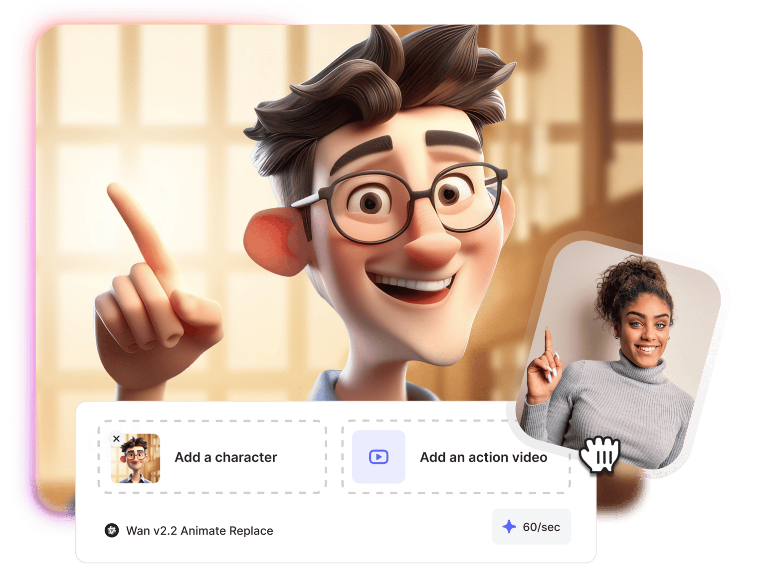 Choose a video-to-video model: Wan v2.2 Move to transfer your video's movements onto a cartoon character image. Or Wan v2.2 Replace to swap the person in your footage with a cartoon character.
