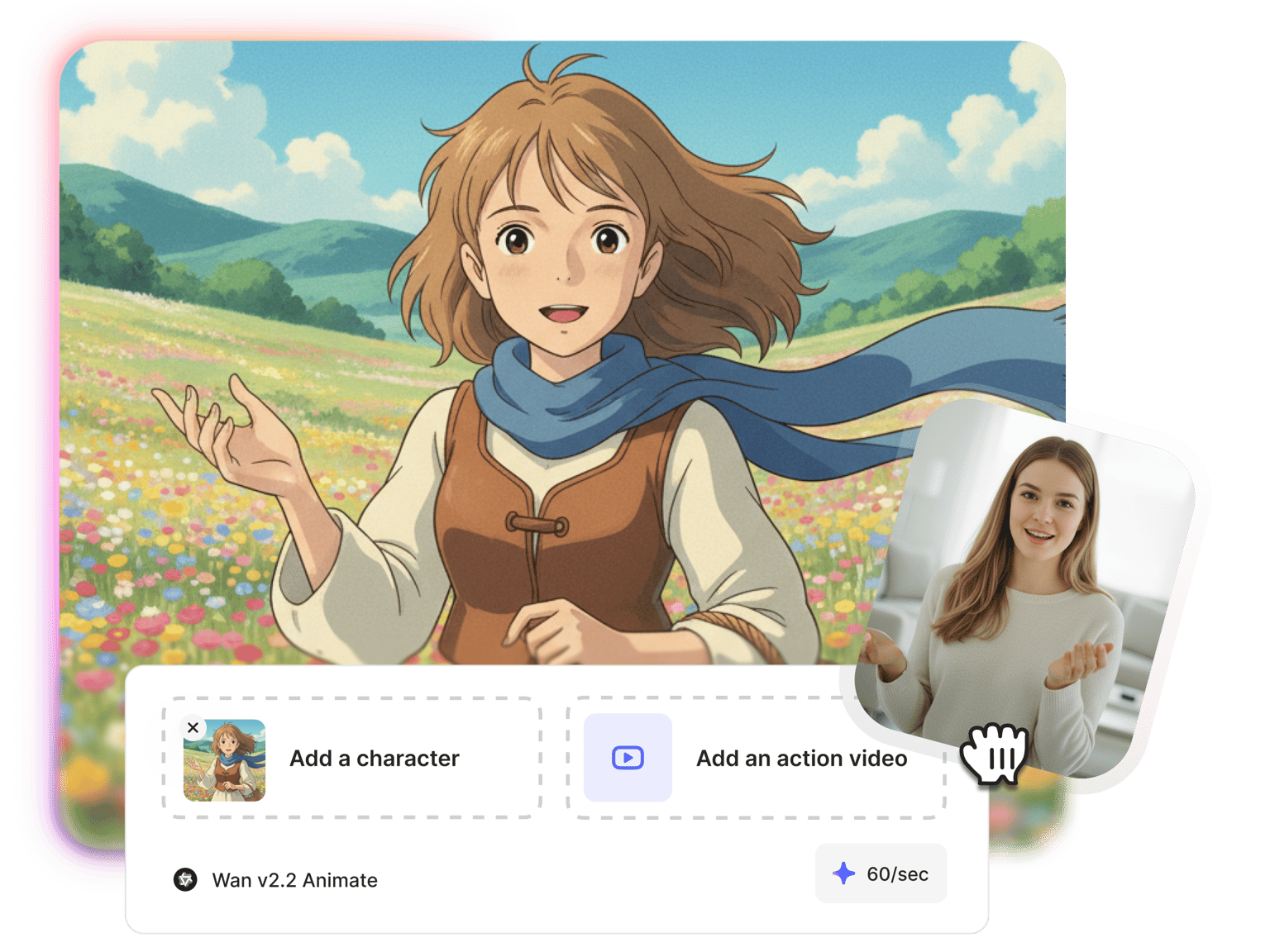 Want to create eye-catching anime content? Upload your video and an anime character image to Wan 2.2 Animate. The video-to-anime converter transfers your movements and voice to the reference image. Watch your anime character move exactly like your video’s subject. Head tilts, gestures, facial expressions, and lip sync all transfer from your footage.