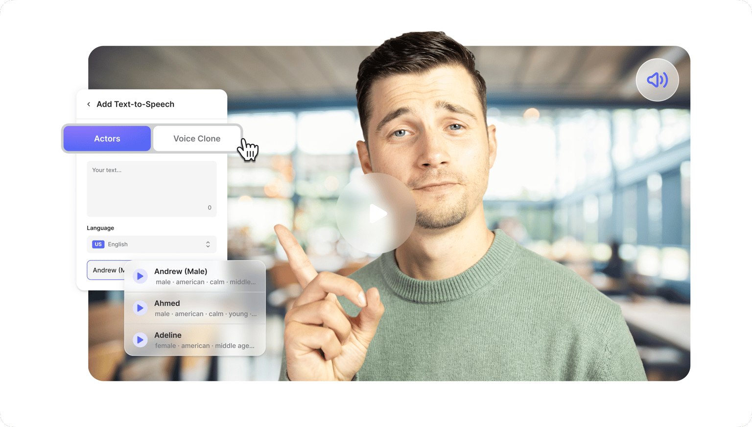 Robotik sesli yapay zeka ses oluşturucularla yetinmeyin! VEED, erkek ve kadın sesi seçenekleri ile gerçekçi ses profilleri sunar. Videonuza eklemeden önce nasıl ses çıkardığını duyabilmek için sesi önizleyebilirsiniz. Metninizin bir insan sesi tarafından okunacağı garanti edilir. Videonuza ses efektleri ve müzik eklemek için stok medya kitaplığımızdan da seçim yapabilirsiniz.