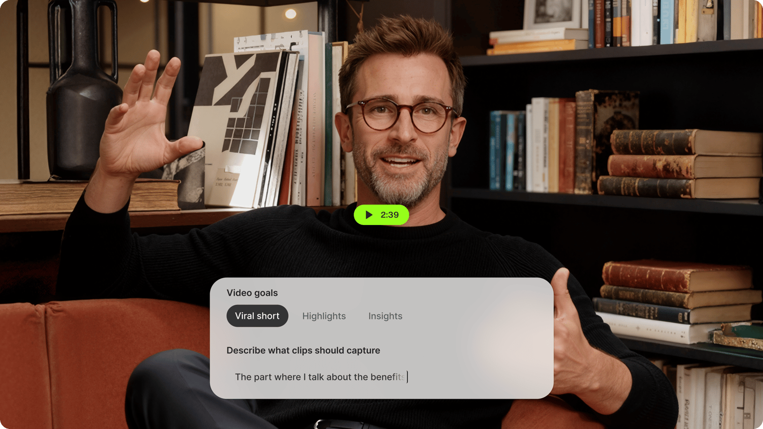 上传您的长视频。通过选择标题风格、视频目标和最大剪辑长度,定制您的剪辑。